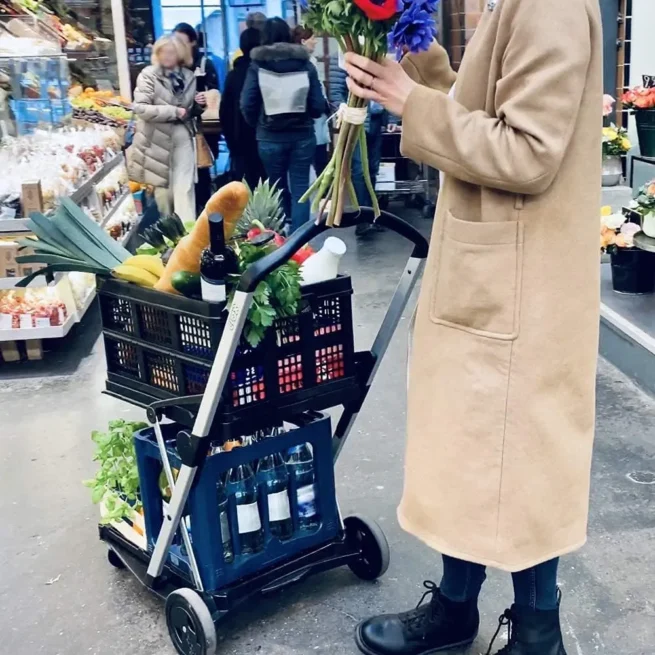 The consists of aluminium and high-quality synthetics. Just by pushing a single button it can be folded or unfolded within seconds. Folded up, it can be easily carried or stored away in a practical manner. As the upper loading area is approx. 130° foldable upwards, it allows for the transport of higher goods on the lower level.