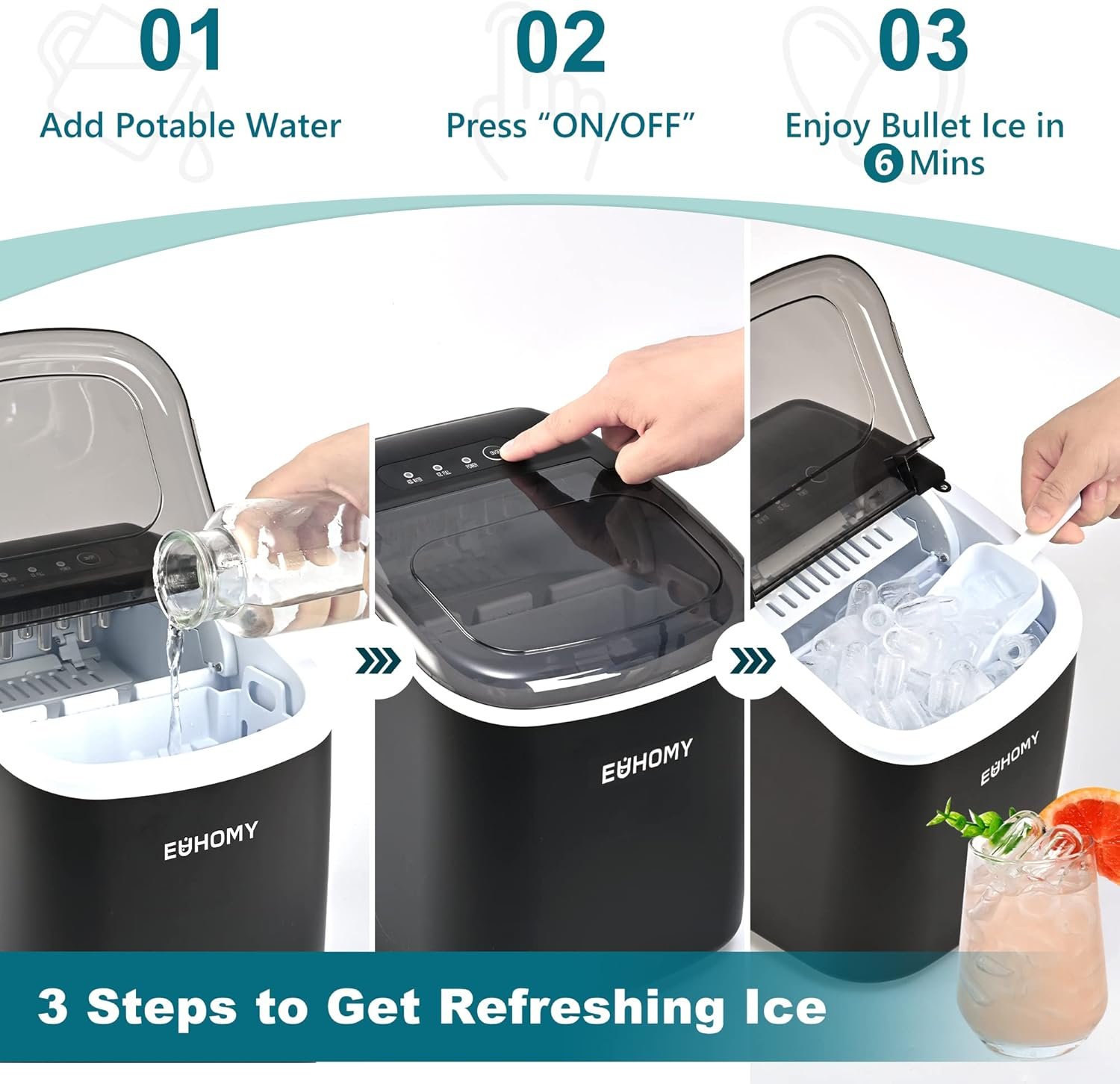 • 6 Mins Ice-Making & Ultra Quieter: Our Euhomy ice maker only takes 6mins that will enjoy the first batch of fresh bullet ice. With a 1.2L water tank and powerful compressor, the portable ice maker easily makes maximum ice capacity to 26lbs ice per day and holds up to 1.3lbs ice at a time. Also, our ice maker is not only excellent in refrigeration, but also at less than 45db normal noise, ensuring a comfortable and quiet environment to enjoy ice-making, similar to a working freezer.