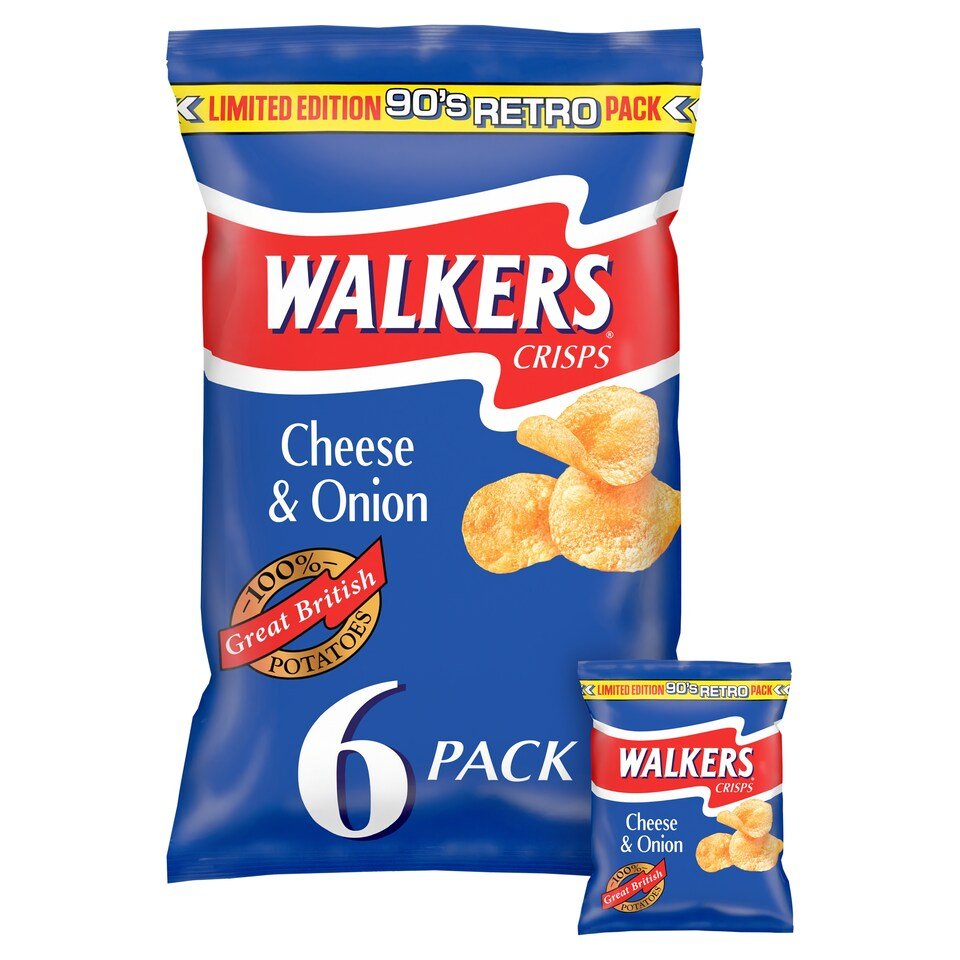 Ready Salted Potato Crisps– Limited Edition 90’s Retro Pack– Throwback look. Timeless crunch. Retro vibes.– Same great taste you know and love from Walkers.– Multipack of Walkers Ready Salted crisps– Made with 100% Great British Potatoes– Fresh taste guaranteed– Perfect crisps for lunch and snacking– Multipack contains 6 bags of crisps– Suitable for vegetarians– No added MSG, Artificial Colours.